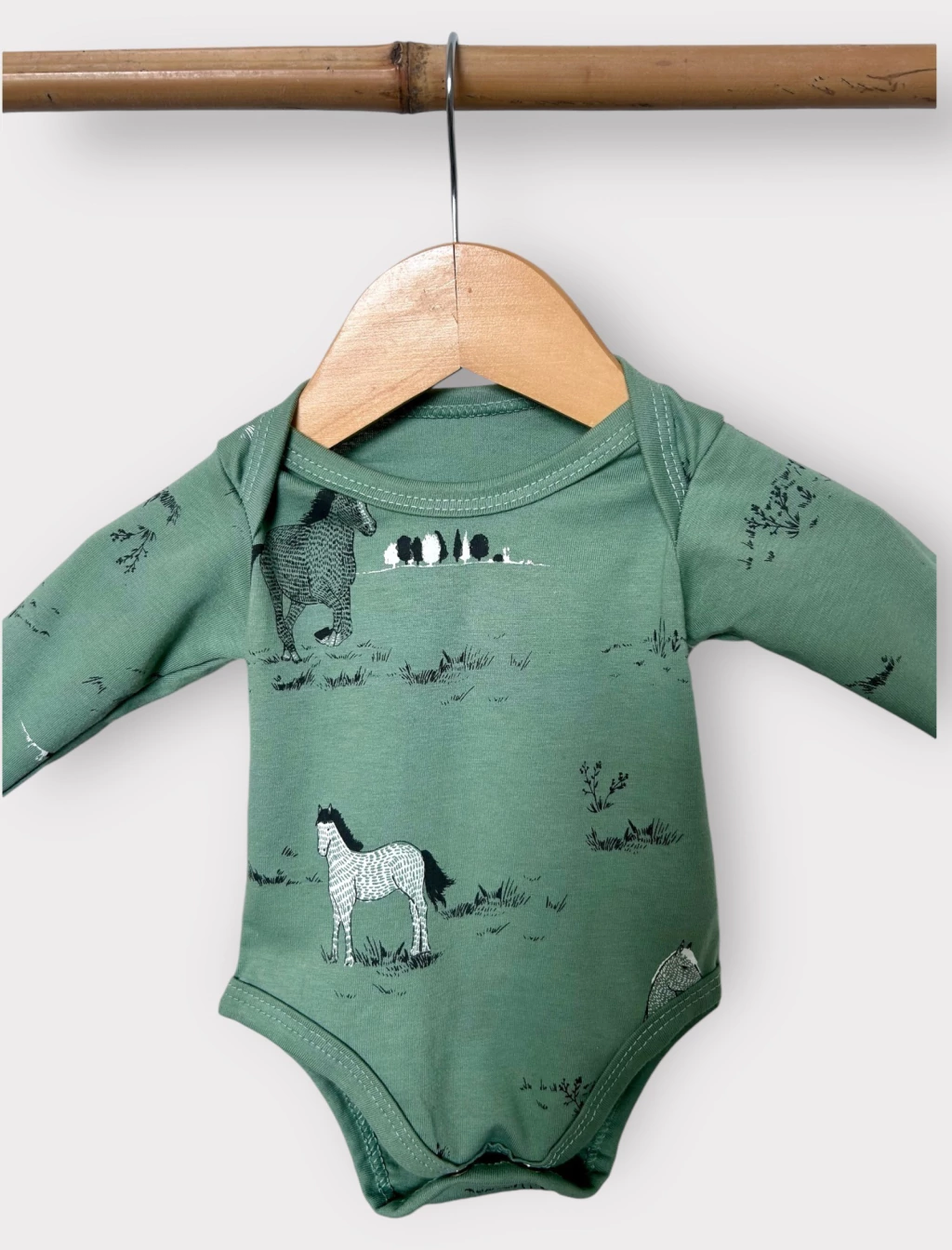 Body 100% algodón estampado a mano con serigrafía. Manga larga. Dos broches inferiores para poder cambiar fácilmente el pañal sin desabrigarlo. Se coloca por arriba, el modelo del body permite la apertura para que su cabecita pase cómodamente.