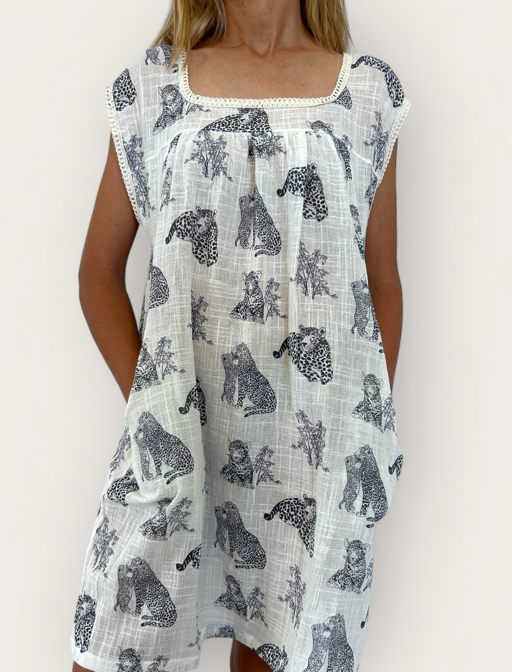 Vestido de gasa de algodón estampada a mano con serigrafía. Con bolsillos. Sin botones.