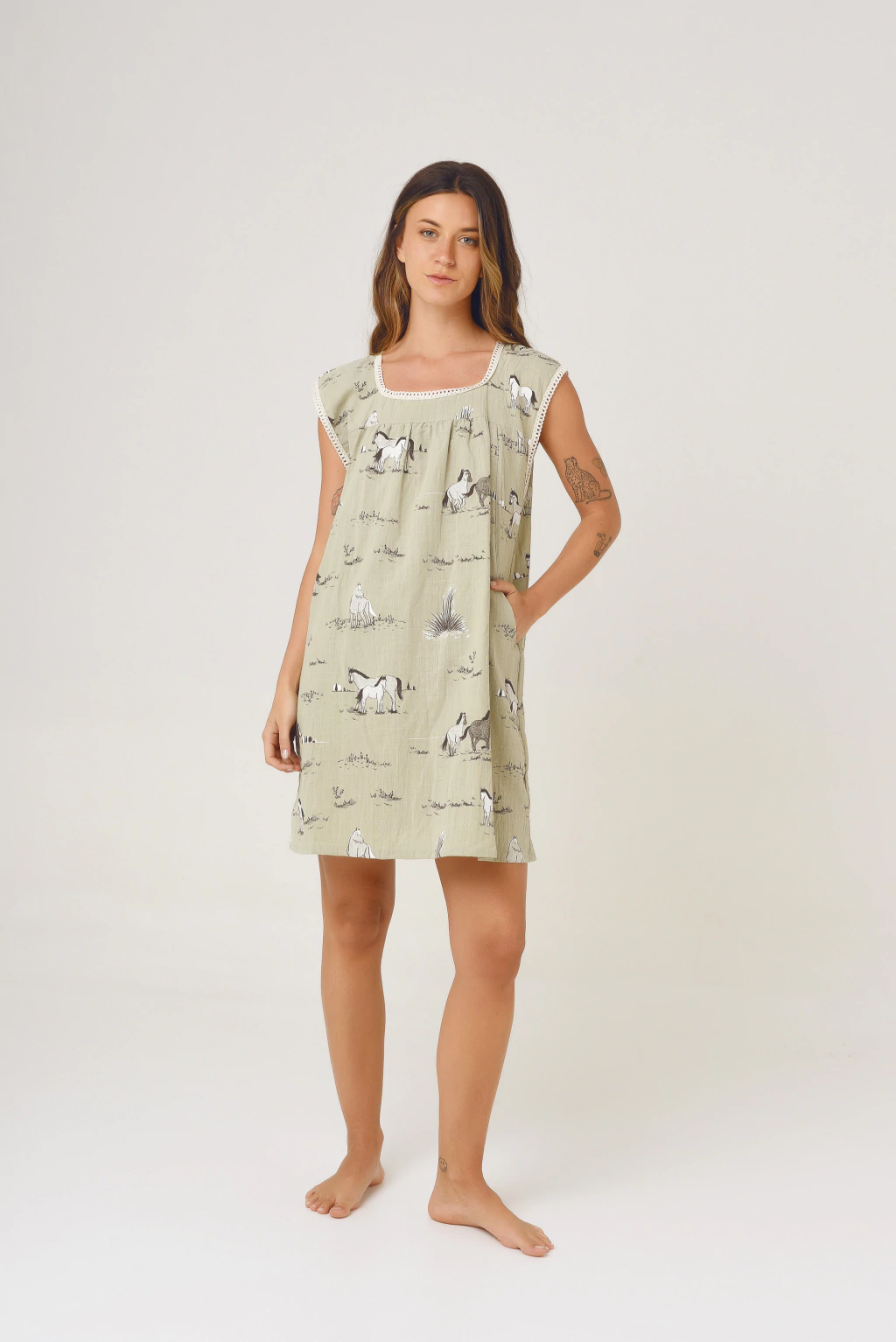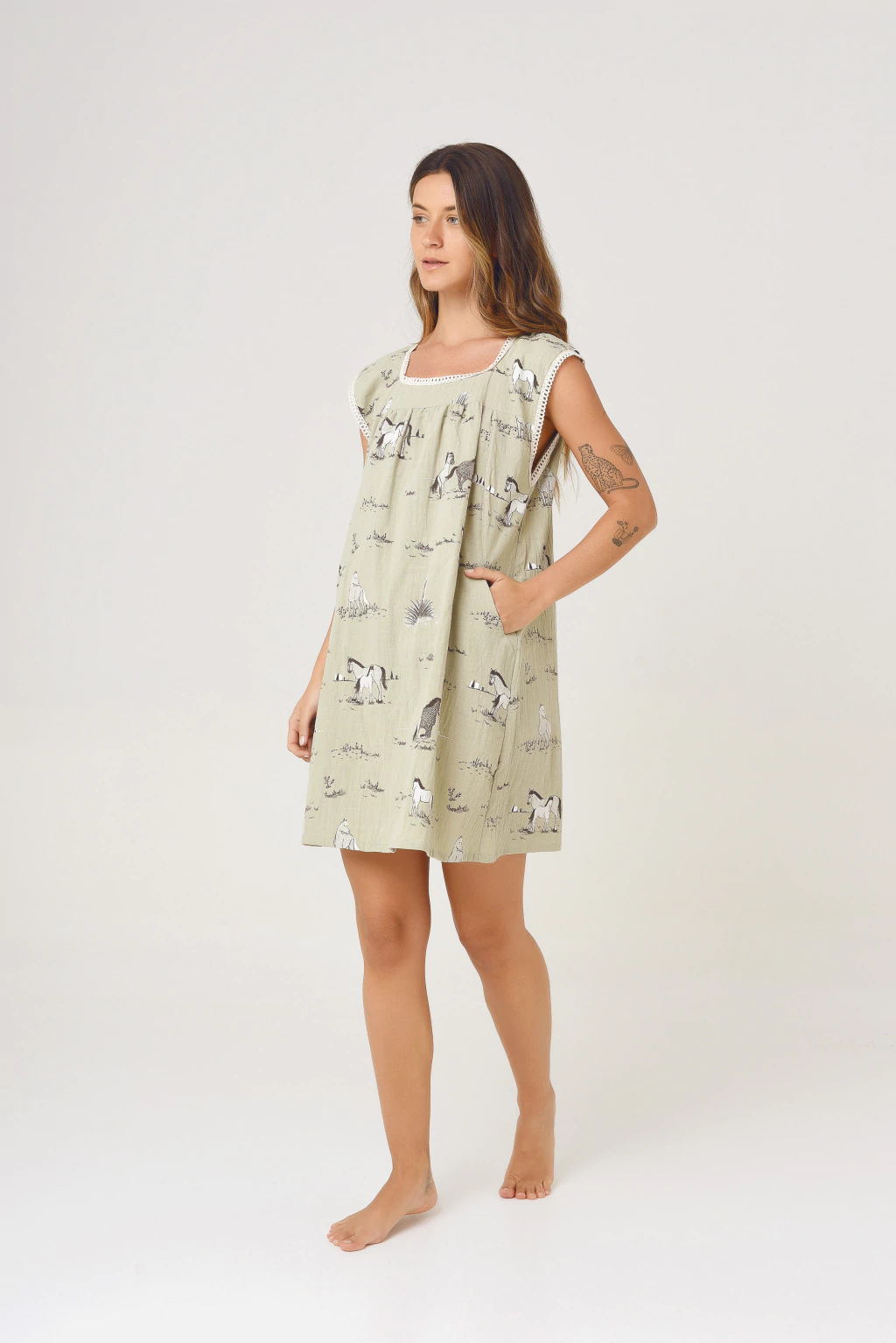 Vestido de gasa de algodón estampada a mano con serigrafía. Con bolsillos.